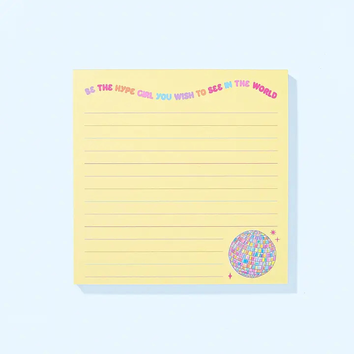 Brighten your notes with the Elise Notepad, featuring a fun disco ball pattern and the playful phrase “By The Hype Girl You Wish To See In The World.” Its cheerful yellow pages make jotting down ideas or reminders a lively experience. Perfect for adding a bit of sparkle to everyday writing!
