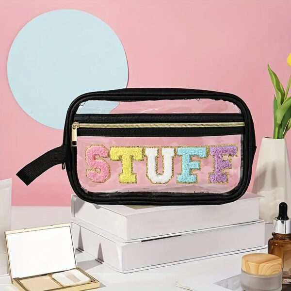 This Chenille Letter Clear Zipper Pouch is a must-have travel accessory that combines style and functionality. It is an ideal choice for anyone who wants to stay organized while on the go, and also makes for a thoughtful and personalized gift. Plenty of room for all the necessities for traveling.