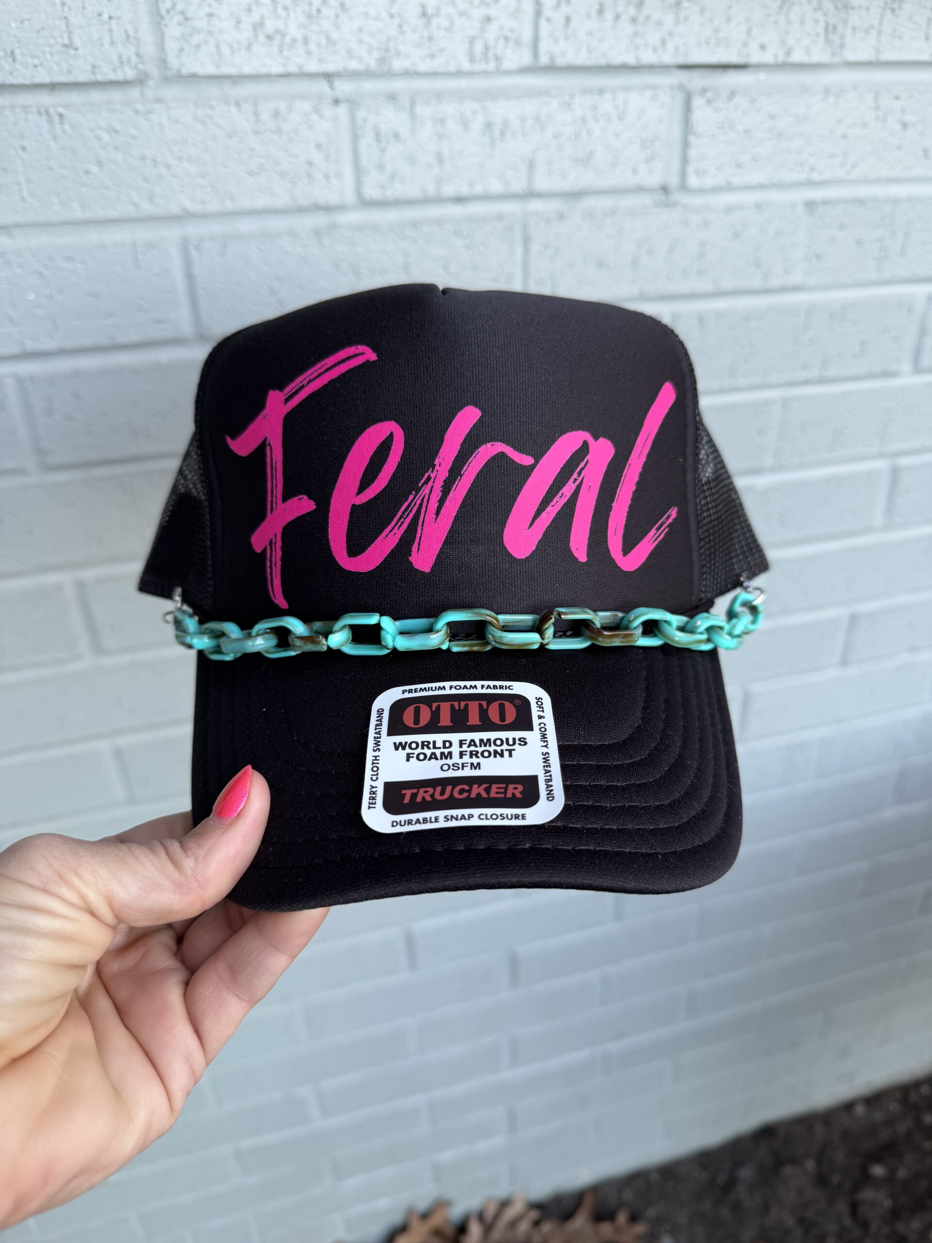 Loud. Playful. Completely unapologetic. This black trucker hat brings bold pink “Feral” lettering front and center, finished with a vibrant teal chain detail that takes it straight into statement territory. The structured foam front keeps its shape, the mesh back keeps it breathable, and the snapback makes it easy to adjust. Throw it on with denim, graphic tees, or an oversized sweatshirt and let it do all the talking.