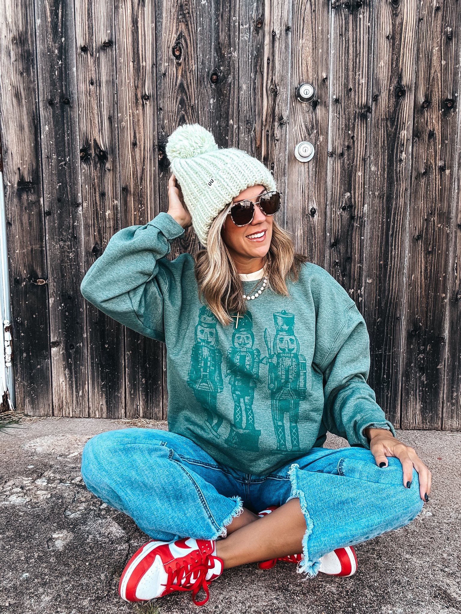 Add a touch of holiday cheer to your wardrobe with our Forest Monochrome Nutcracker Sweatshirt. Featuring a heather forest base with playful green nutcrackers, this cozy sweatshirt is perfect for spreading Christmas joy. ‘Tis the season to be jolly, and this festive top will have you feeling holly jolly all season long!