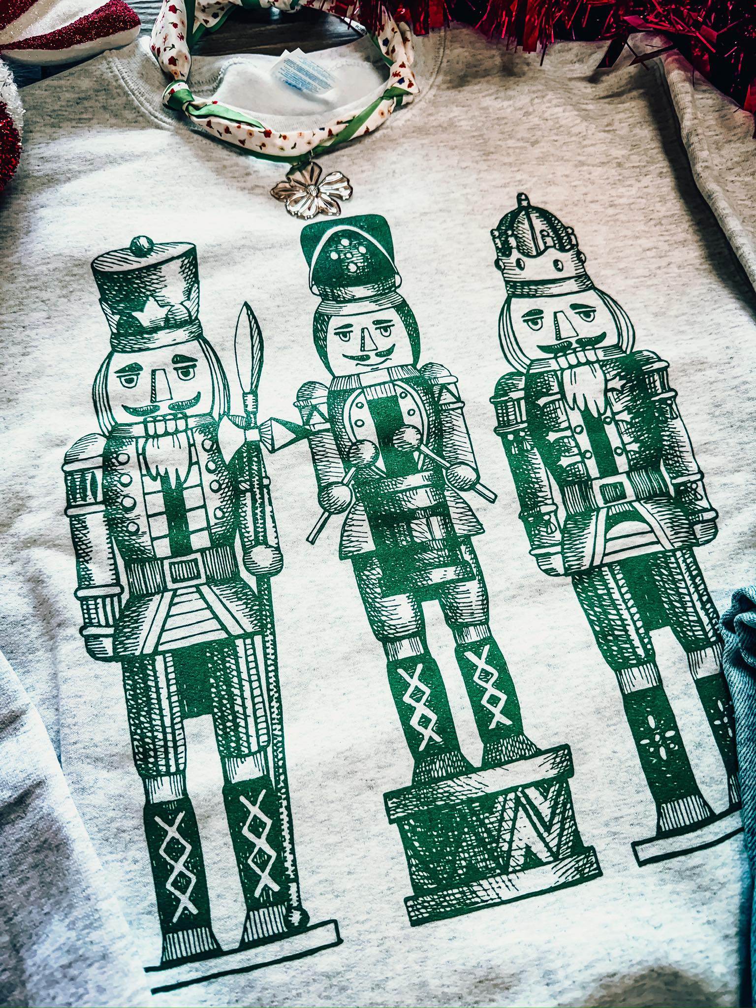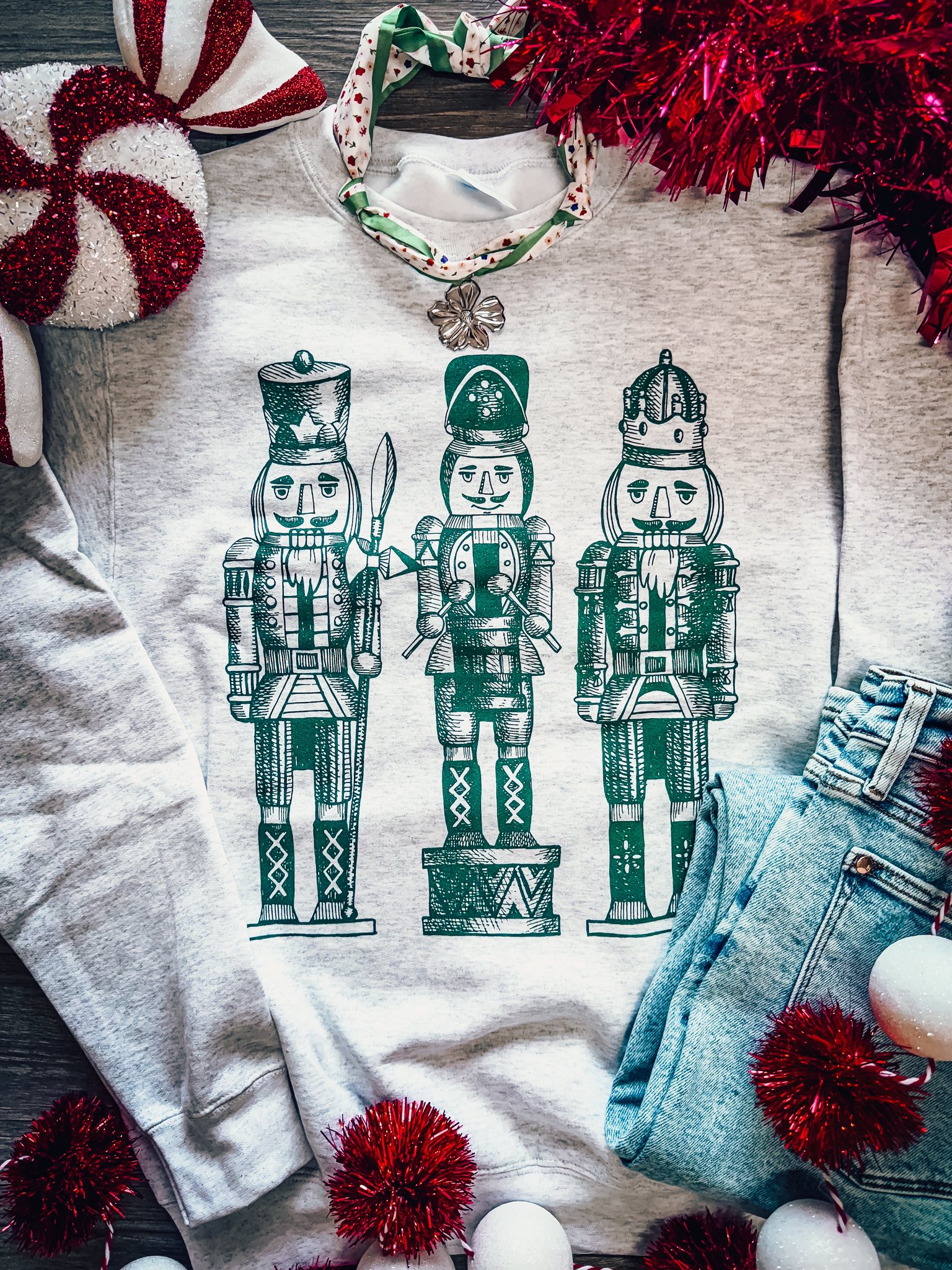 Add a touch of holiday cheer to your wardrobe with our Nutcracker Sweatshirt. Featuring a heather gray base with playful green nutcrackers, this cozy sweatshirt is perfect for spreading Christmas joy. ‘Tis the season to be jolly, and this festive top will have you feeling holly jolly all season long!