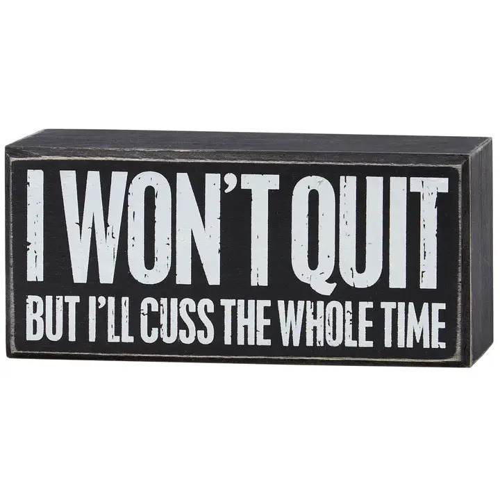 A classic black and white wooden box sign from our Box Sign Collection displaying a sassy sentiment that reads “I Won’t Quit But I’ll Cuss The Whole Time.” Funny box sign features distressed details with coordinating black color on sides and back. Our I Won’t Quit But box sign is easy to hang or can free-stand alone. A funny gift that can be easily displayed in any home or work space.