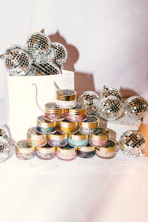 These hand-blended glitter combinations are sure to be the life of the party! Pick from one of our festive shades or create your own! These glitters are blended with gel so they apply flawlessly to the skin.