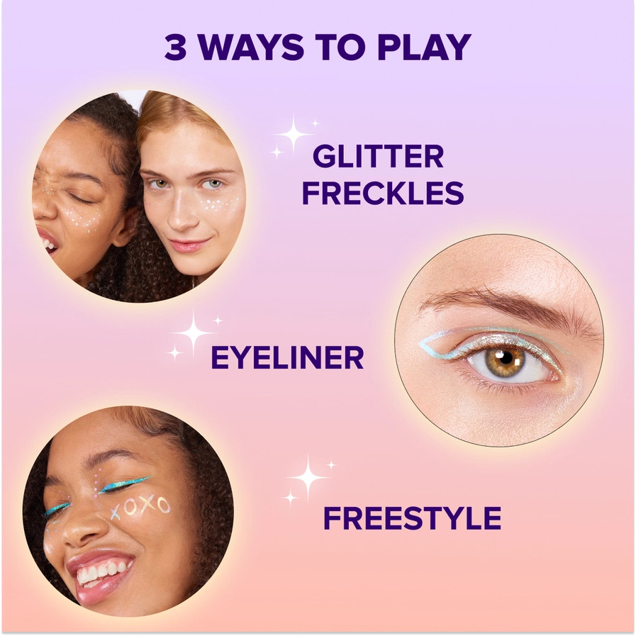 Glitter Freckles is a 3-in-1 product that’s an eyeliner too. Decorate yourself with designs anywhere you like. Waterproof & long-lasting, it stays put through sweat & tears. It has a fine precision brush for best results!